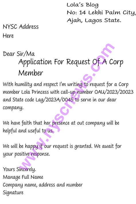 Nysc Request Letter Template - To get nysc to post them to that specific ppa, they must submit a request letter. The nysc request letter is a letter you can write to nysc management to request a particular corps member to serve in your company or organization. Furthermore, if you are a corps member, i will explain. The nysc request letter format is for people.